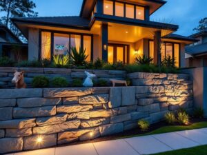Architect-designed luxury landscaping featuring natural rock elements and premium plantings.